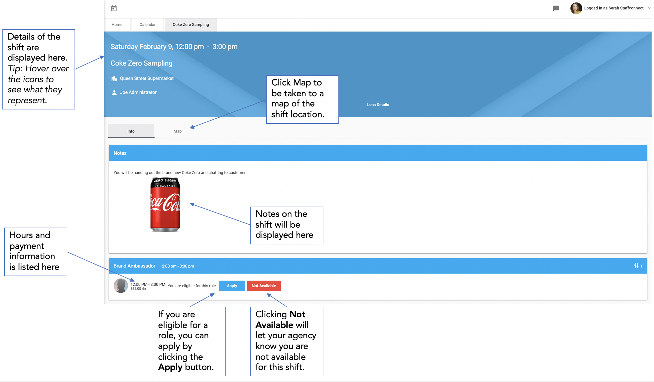 Here is where you can view and apply for the work available to you and tell the shifts status by its colour.