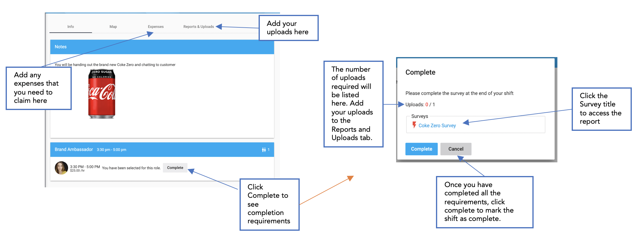 6) You log in to upload pictures, complete surveys, claim expenses and mark the shift as complete.