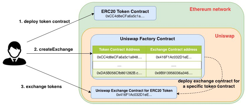 Uniswap allows only one market per ERC20 token. The market creator sets the exchange rate, which shifts through trading due to Uniswap’s “constant product market maker” mechanism. When trading reduces one side of the pair’s liquidity relative to the other, the price changes. This creates arbitrage opportunities, encouraging more trading.