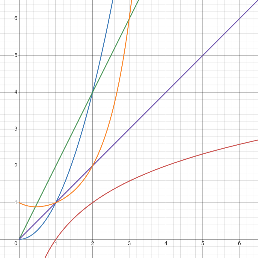 \(x! > x^2 > 2x > x > log_2(x)\)