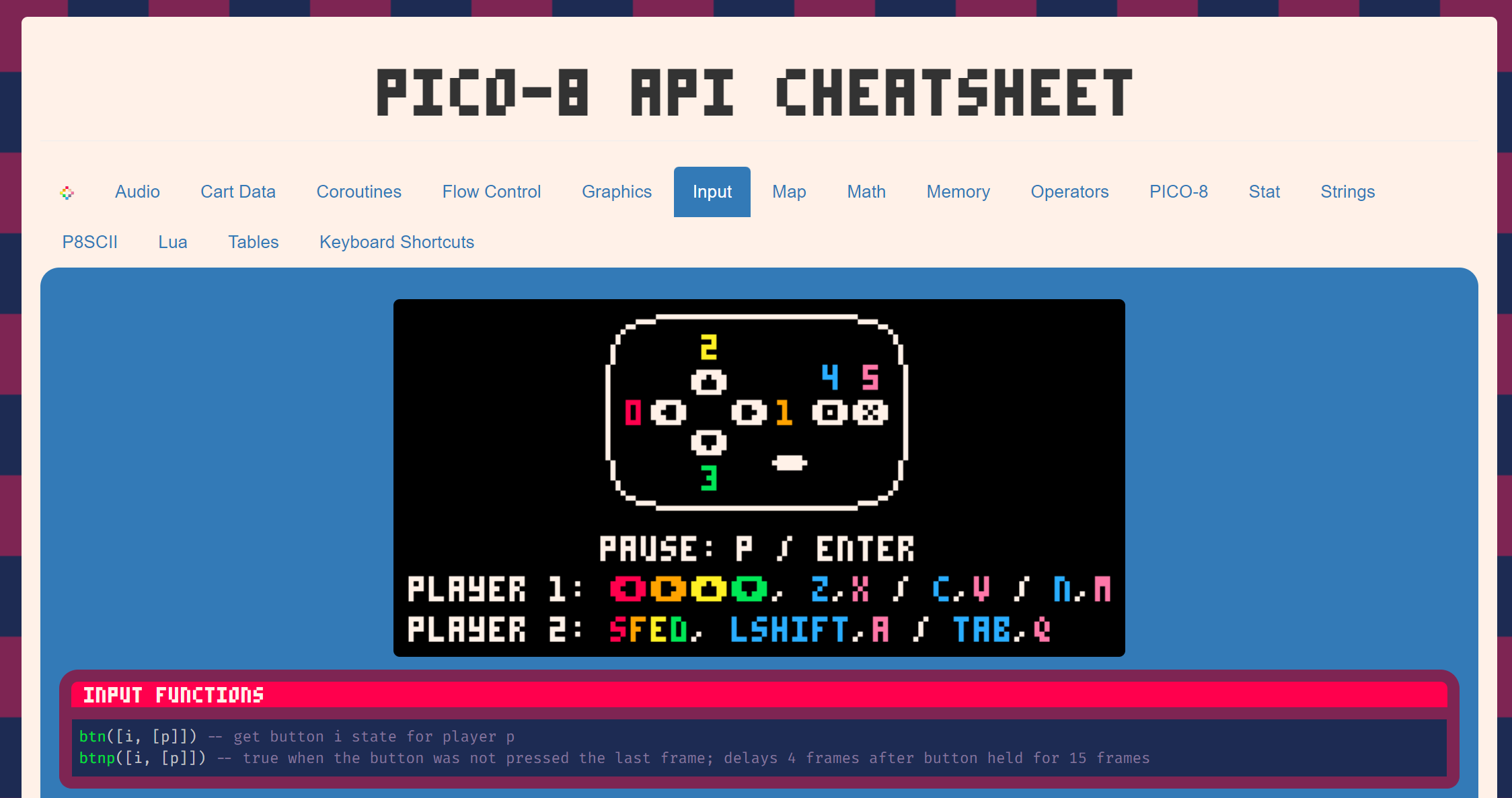 就像早期遊戲主機,Pico-8 只有 6 個輸入: