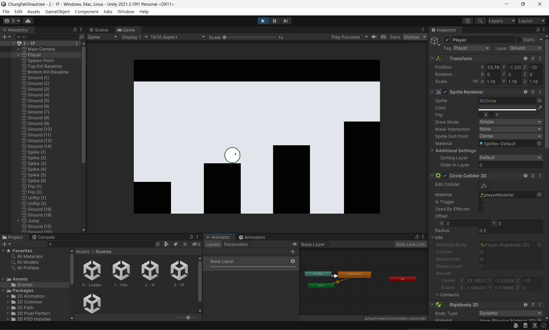 - 進階關卡布置:死亡尖刺、重生點系統、實作粒子效果、掉落方塊