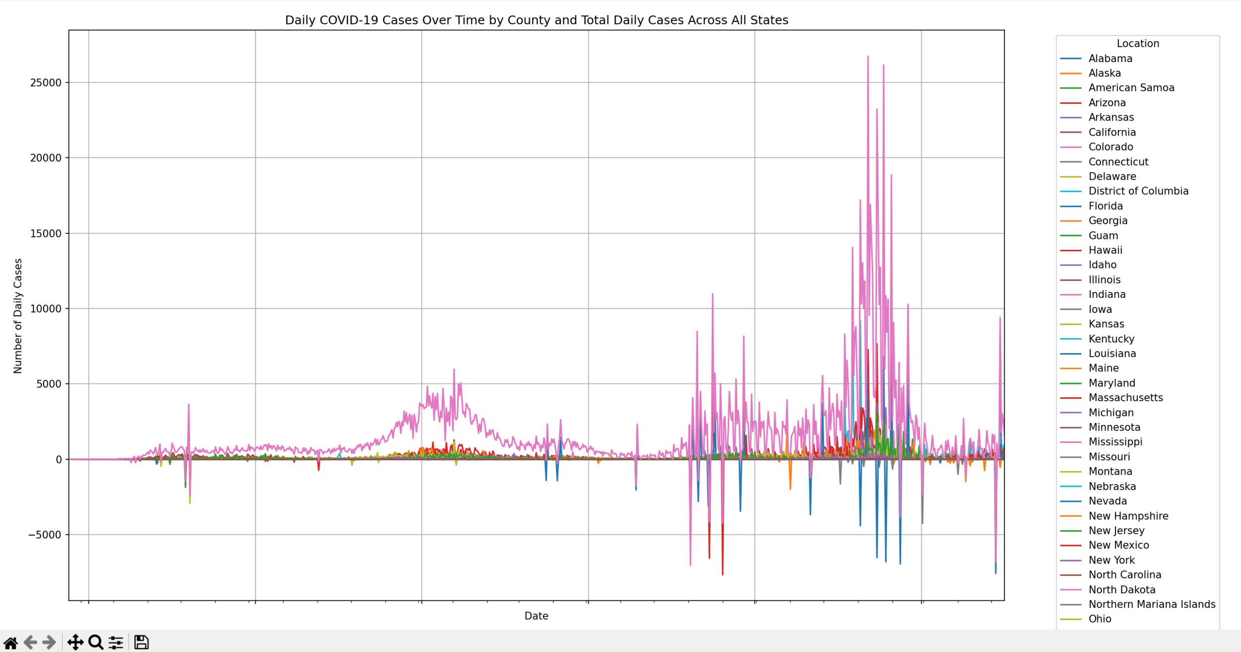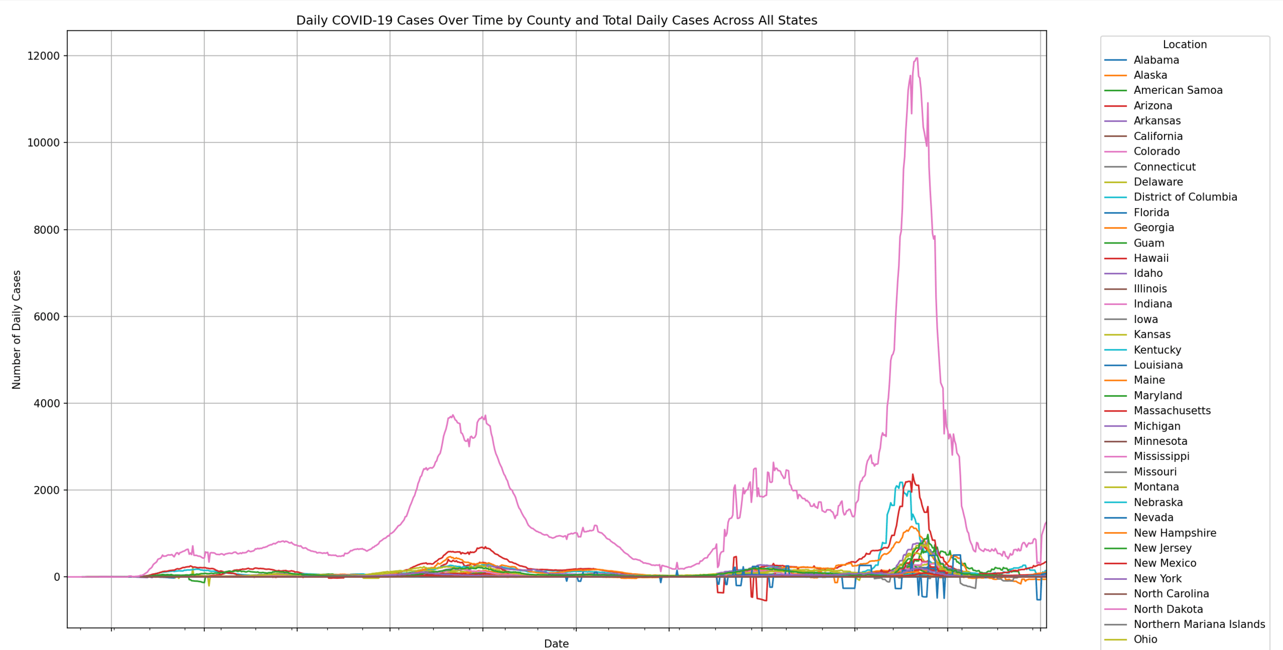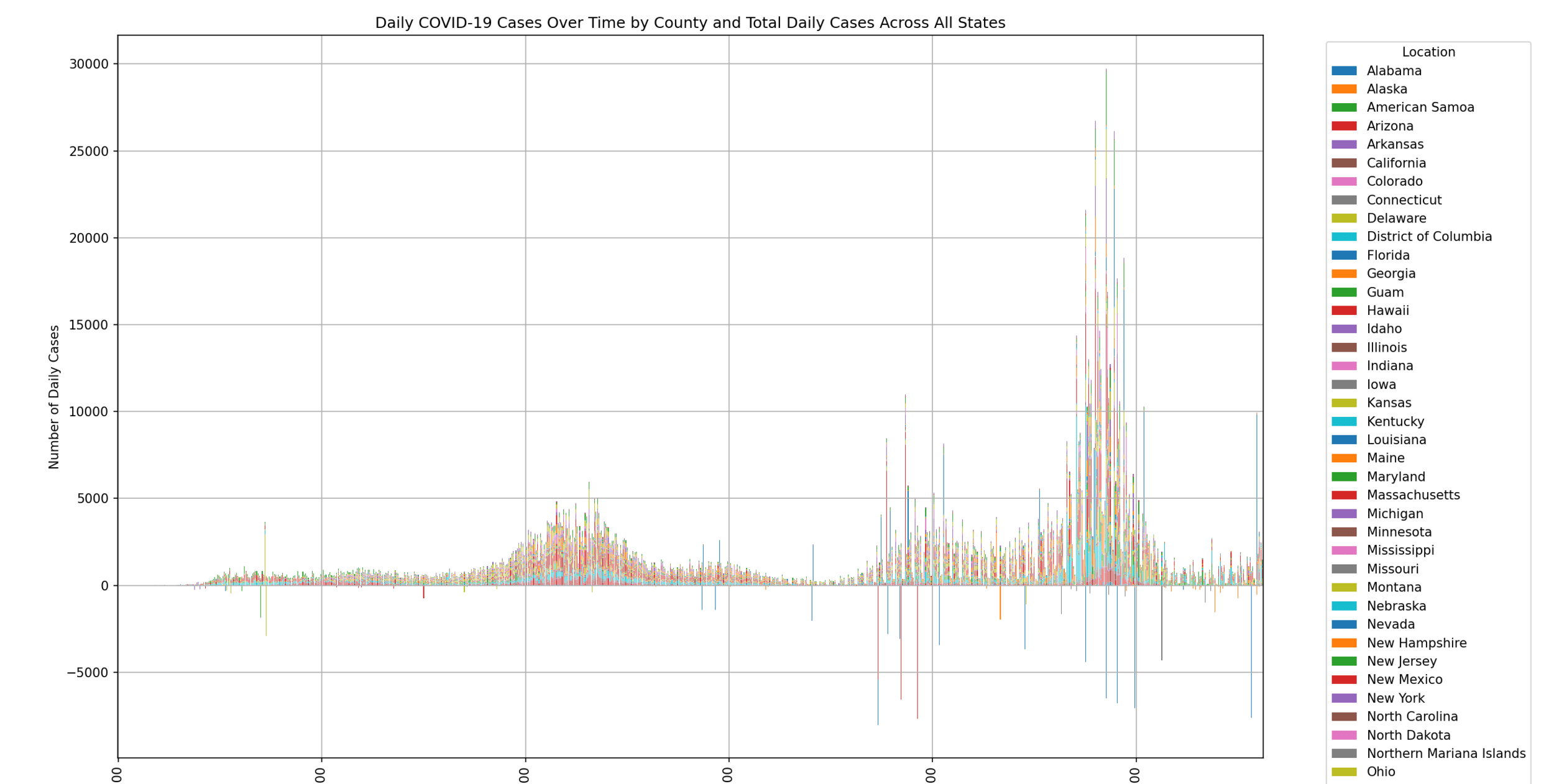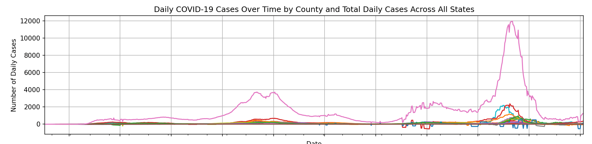 plt.title('Daily COVID-19 Cases Over Time by County and Total Daily Cases Across All States')
