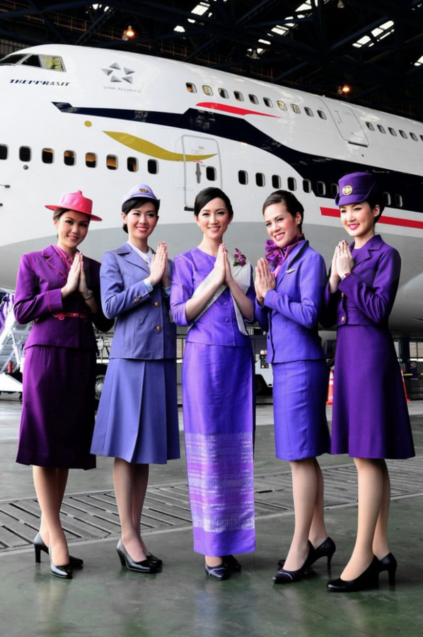 นี่เป็นเอกลัษณ์ที่โดดเด่นอีกอย่างหนึ่ง ของการบินไทย เพราะว่า ชุดออกแบบมาเพื่อคงเอกลักษณ์ความเป็นไทยมากที่สุด และโดดเด่นด้วยสีม่วงซึ่งเป็นสีหลักของการบินไทยนั่นเอง