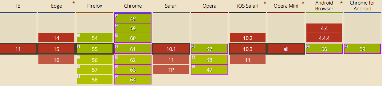 Support: Chrome 56+, FF 27+, IE10+, Safari 9+