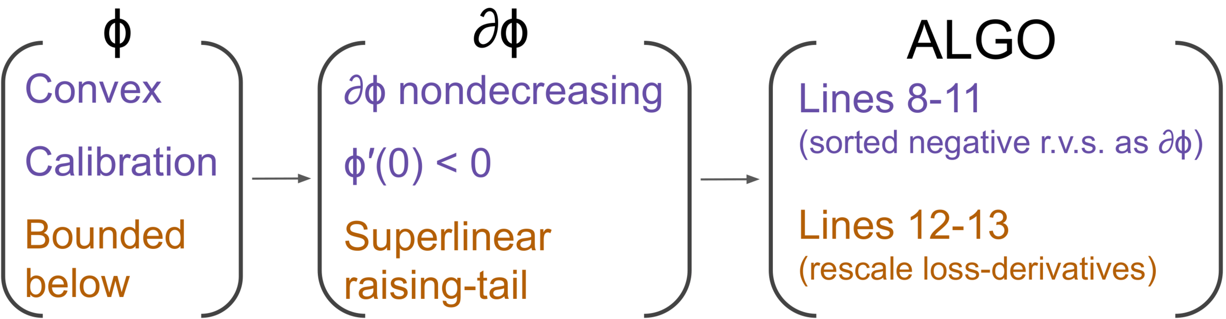 Theorem 1 (Bartlett et al. (2006)) Let \(\phi\) be convex. Then \(\phi\) is classification-calibrated iff it is differentiable at 0 and \(\phi'(0) < 0\).