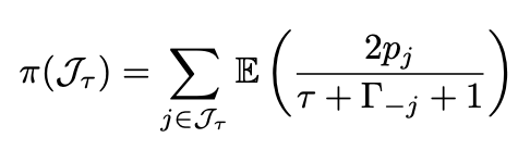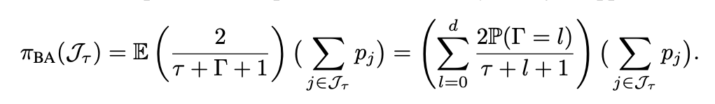$$ \tau^* = \arg\max_{\tau \in \{0,1,\cdots,d\}} \Big( \sum_{j \in J_\tau(\mathbf{x})} \mathbb{E} \big( \frac{2p_j(\mathbf{x})}{\tau + \Gamma_{-j}(\mathbf{x}) + \gamma + 1 } \big) + \gamma \mathbb{E} \big( \frac{1}{\tau + \Gamma + \gamma} \big) \Big) $$