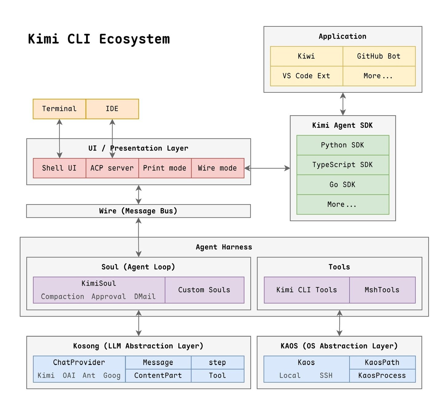 - Rust 代码:三个 crate(kagent、kosong、kaos)的完整实现