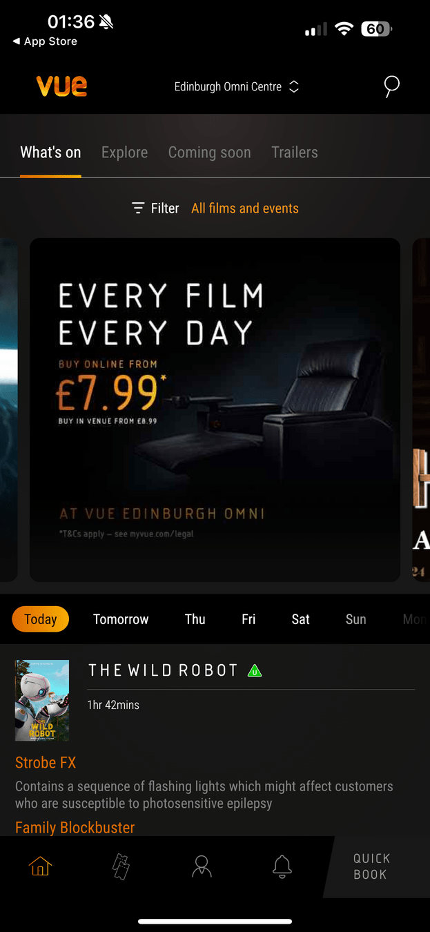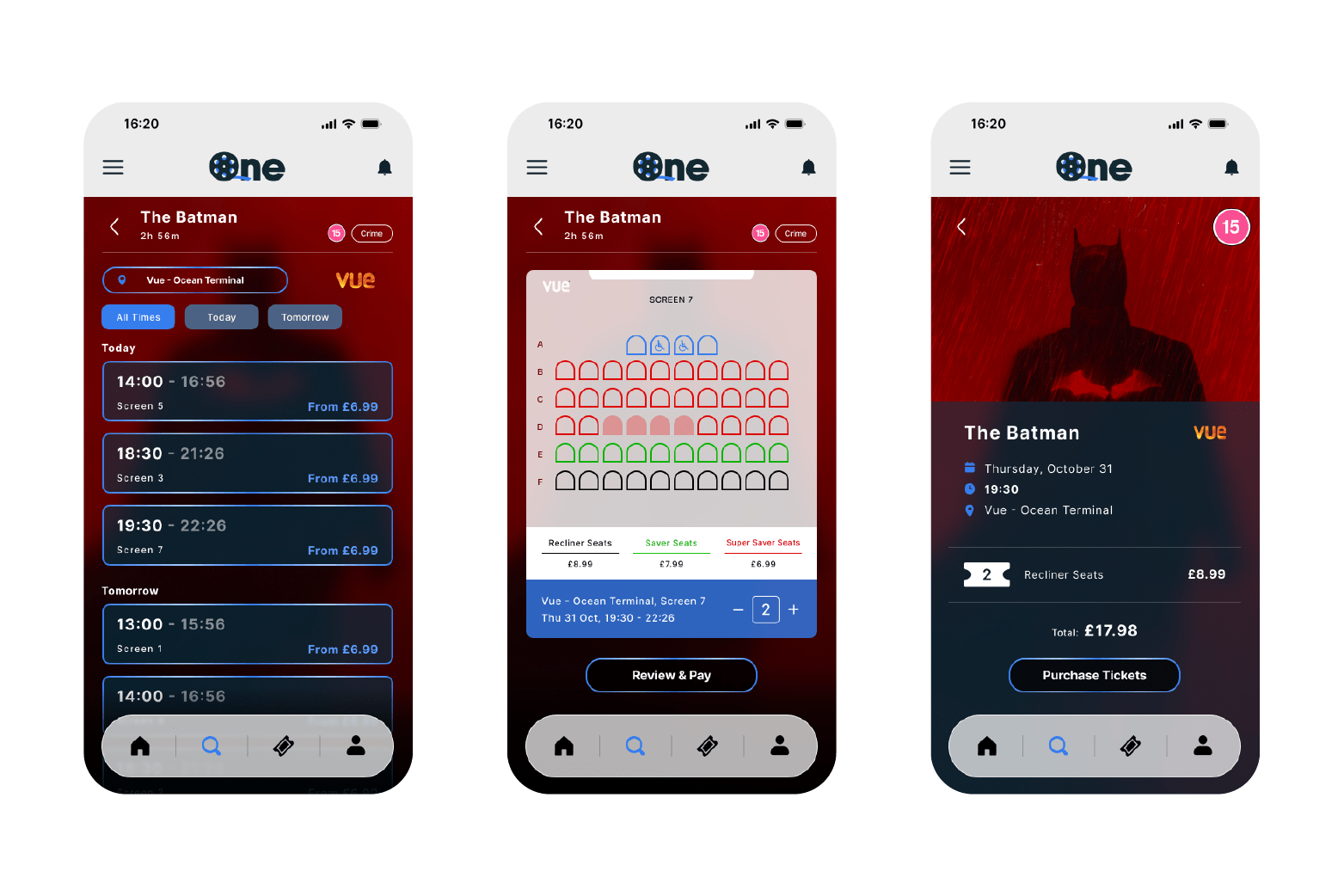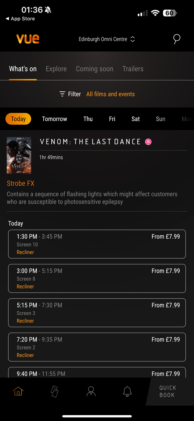 Selecting a film will trigger a pop-up that shows the times and prices of the tickets. You can also change to a different Vue cinema from here.