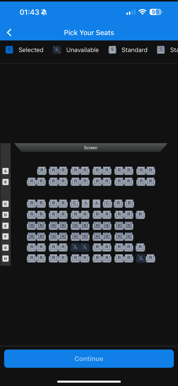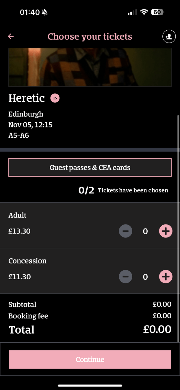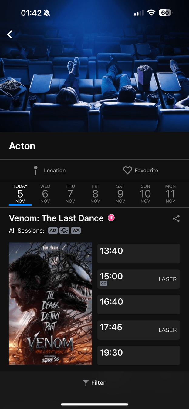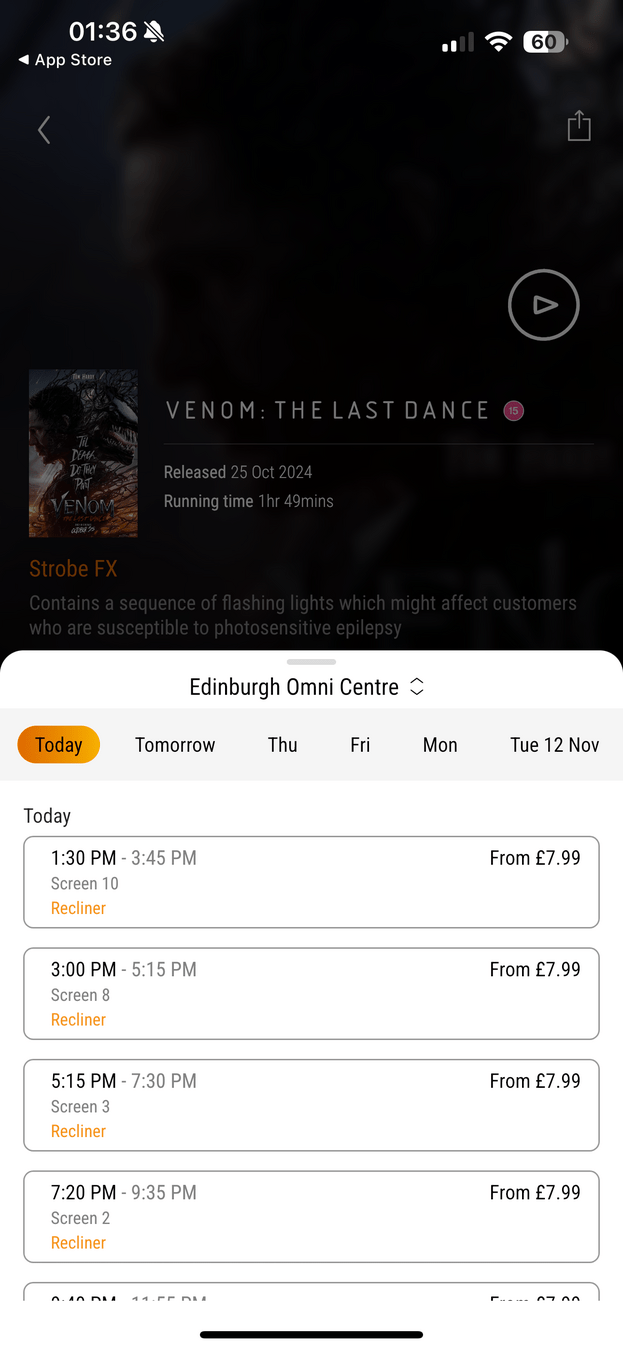 Selecting a film will trigger a pop-up that shows the times and prices of the tickets. You can also change to a different Vue cinema from here.