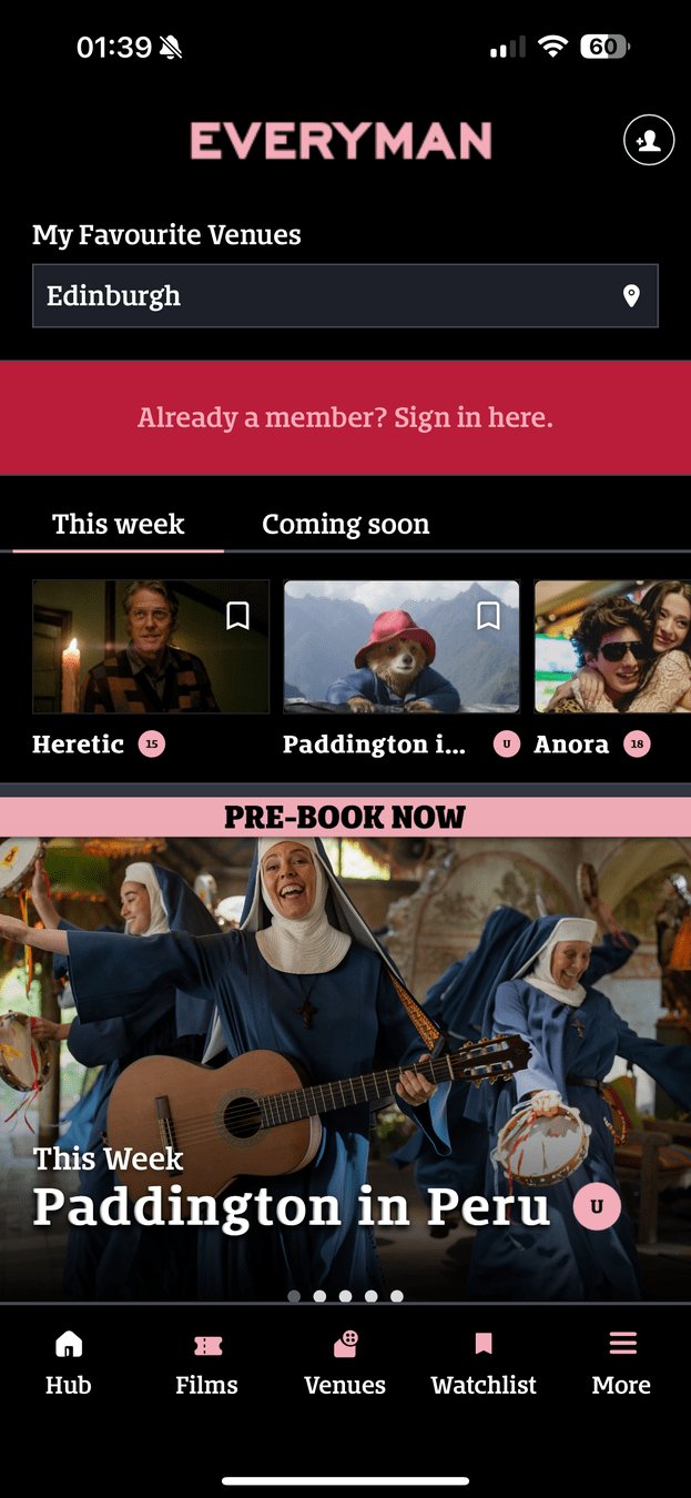 The Home page for the Vue app has everything you need to navigate to where you want to go. Whether that’s searching for the particular film you want to see or see what’s on.