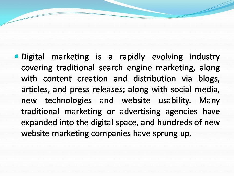 Digital marketing is a rapidly evolving industry covering traditional search engine marketing, along with content creation and distribution via blogs, articles, and press releases; along with social media, new technologies and website usability.