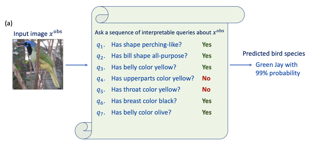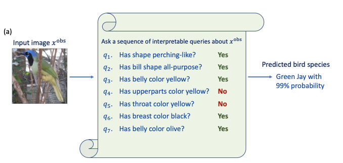 The resulting explanations resemble a game of 20 questions, where queries belong to \(Q\) and the goal is to reach a high-level of confidence in the correct answer \(y\).