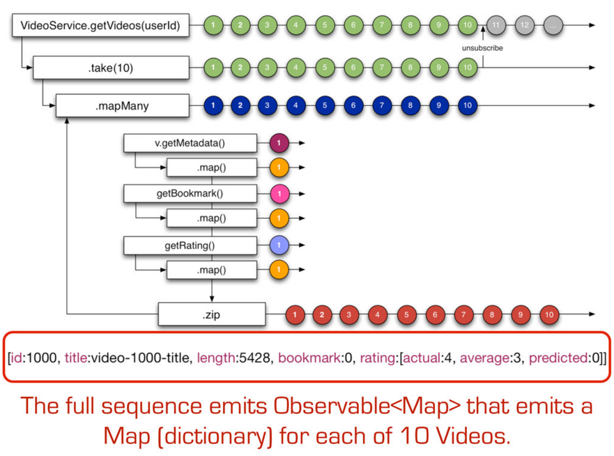 }The "zip" operator combines the 3 asynchronous Observables into 1