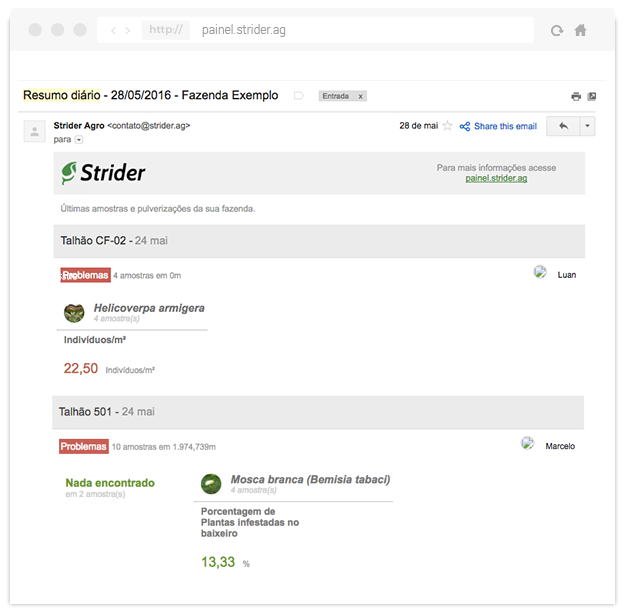 Alertas de monitoramento no seu email. Situação atual dos talhões no seu smartphone.