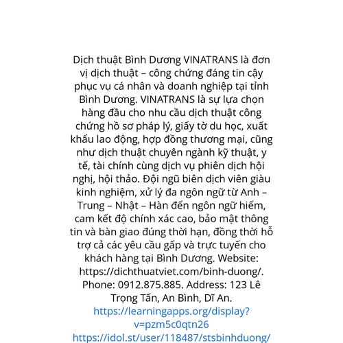 Website: https://dichthuatviet.com/binh-duong/. VINATRANS Dịch thuật Bình Dương là đơn vị dịch thuật – công chứng đáng tin cậy phục vụ cá nhân và doanh nghiệp tại khu vực Bình Dương. VINATRANS là sự lựa chọn hàng đầu cho khách hàng khi có nhu cầu dịc