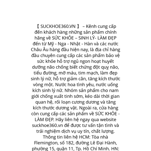 Website: https://suckhoe360.vn/. 【 SUCKHOE360.VN 】 – Kênh cung cấp đến khách hàng những sản phẩm chính hãng về SỨC KHỎE – SINH LÝ- LÀM ĐẸP đến từ Mỹ - Nga - Nhật - Hàn và các nước Châu Âu hàng đầu hiện nay, là địa chỉ hàng đầu chuyên cung cấp các sản