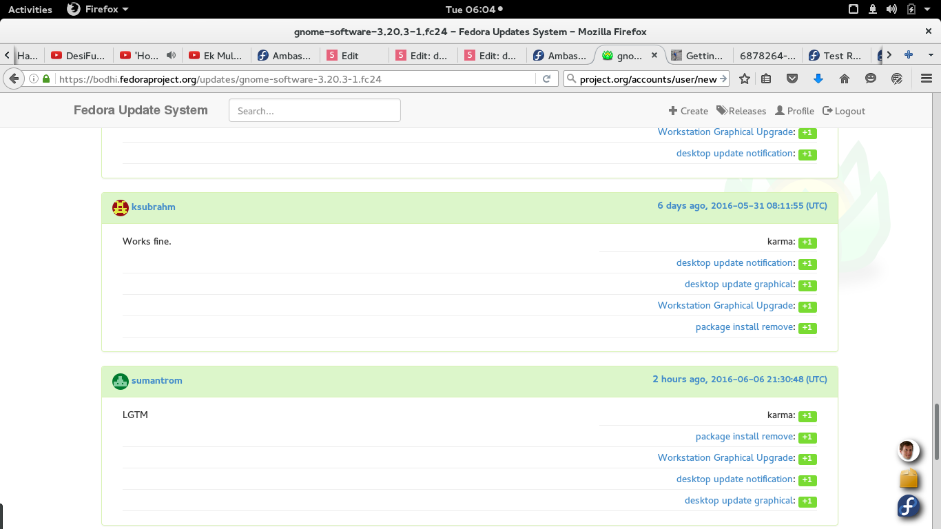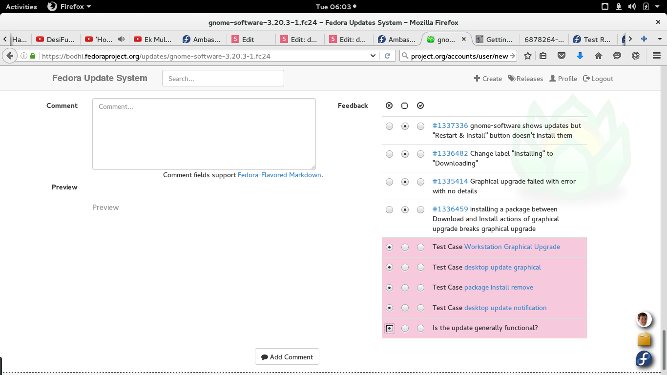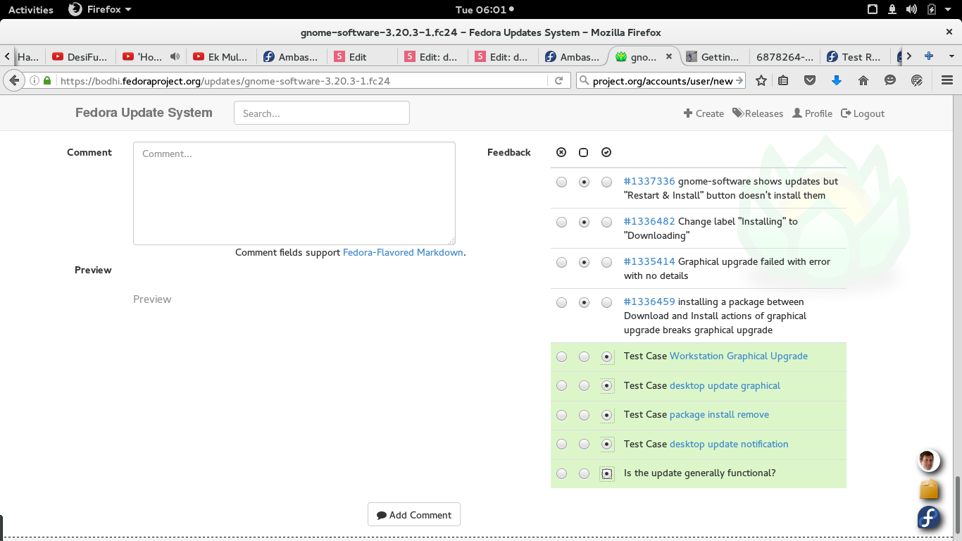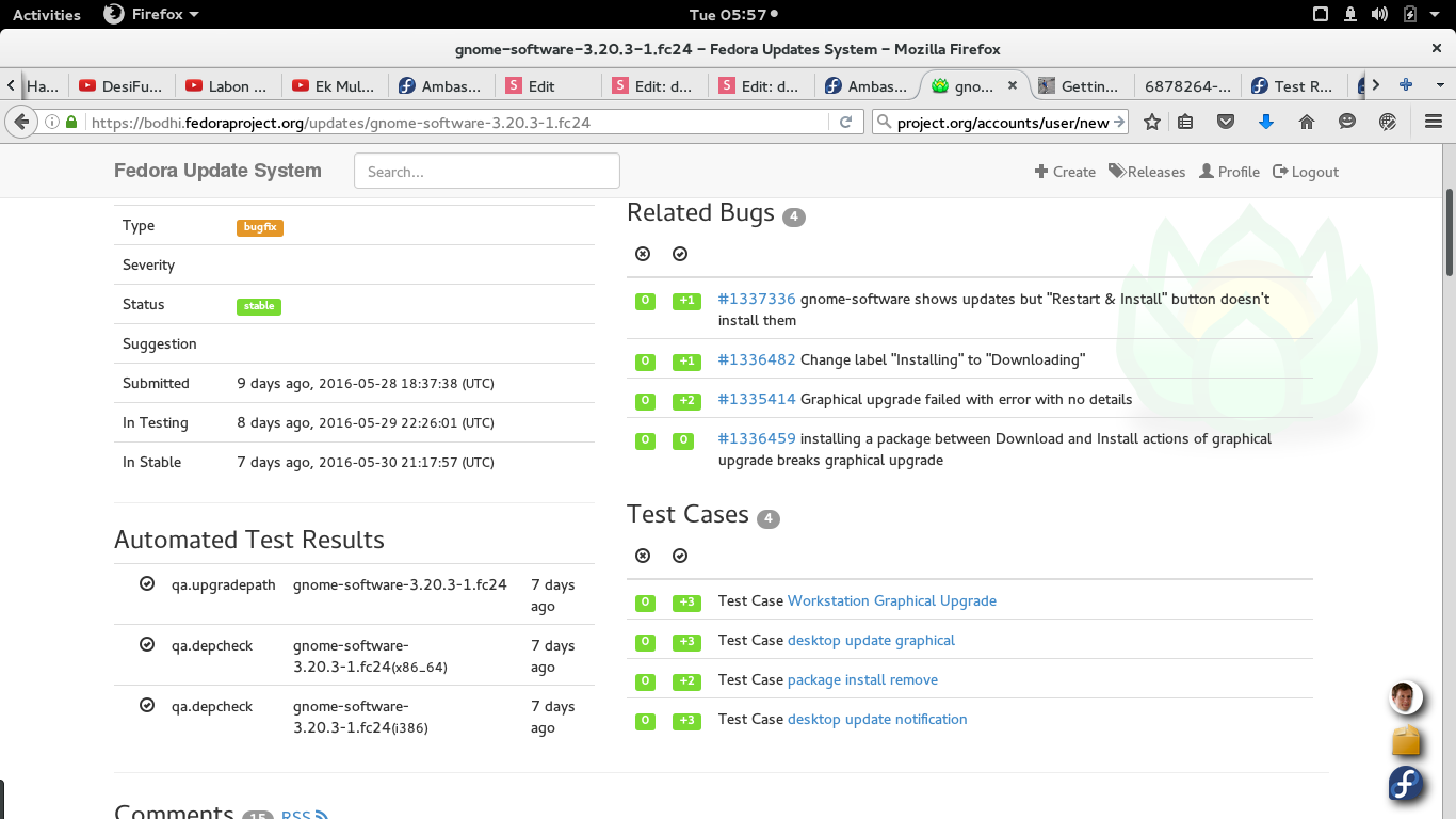 Before and after Fedora releases, there are updates that keep coming in to fix bugs or add minor features to packages included in Fedora. To ensure that these are stable and don’t affect the performance of the existing system, we do “update testing”. Once testing is complete, we share our results and make sure that the developer is aware about the bugs and the success rate of the package.