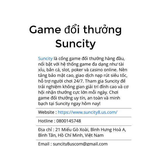 Suncity là cổng game đổi thưởng hàng đầu, nổi bật với hệ thống game đa dạng như tài xỉu, bắn cá, slot, poker và casino online. Nền tảng bảo mật cao, giao dịch nạp rút siêu tốc, hỗ trợ người chơi 24/7. Website : https://www.suncity8.us.com/