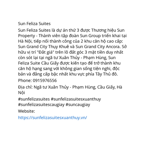 Sun Feliza Suites Xuân Thủy - Trực tiếp Sun Group 0915976556 Ngã tư Xuân Thủy - Phạm Hùng, Cầu Giấy, Hà Nội Website: https://sunfelizasuitesxuanthuy.vn/