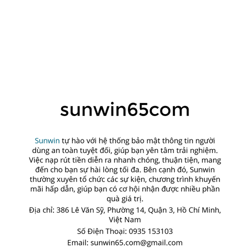 Sunwin tự hào với hệ thống bảo mật thông tin người dùng an toàn tuyệt đối, giúp bạn yên tâm trải nghiệm. Việc nạp rút tiền diễn ra nhanh chóng, thuận tiện, mang đến cho bạn sự hài lòng tối đa. Bên cạnh đó, Sunwin thường xuyên tổ chức các sự kiện, chương trình khuyến mãi hấp dẫn, giúp bạn có cơ hội nhận được nhiều phần quà giá trị. Địa chỉ: 386 Lê Văn Sỹ, Phường 14, Quận 3, Hồ Chí Minh, Việt Nam Số Điện Thoại: 0935 153103 Email: sunwin65.com@gmail.com Website: https://www.sunwin65.com/ #sunwin #taisunwin #taixiusunwin #linktaisunwin