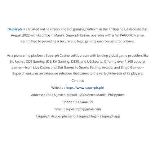 Superph is a trusted online casino and slot gaming platform in the Philippines, established in August 2022 with its office in Manila. Superph Casino operates with a full PAGCOR license, committed to providing a secure and legal gaming environment for players. As a pioneering platform, Superph Casino collaborates with leading global game providers like Jili, Fachai, CQ9 Gaming, JDB, KA Gaming, DS88, and UG Sports. Offering over 1,800 popular games—from Live Casino and Slot Games to Sports Betting, Arcade, and Bingo Games—Superph ensures an extensive selection that caters to the varied interests of its players. Contact: Website : https://www-superph.ph/ Address : 7857 S Javier, Makati, 1230 Metro Manila, Philippines Phone : 0905444999 Gmail : superphph@gmail.com #superph #superphcasino #superphlogin #superphapp