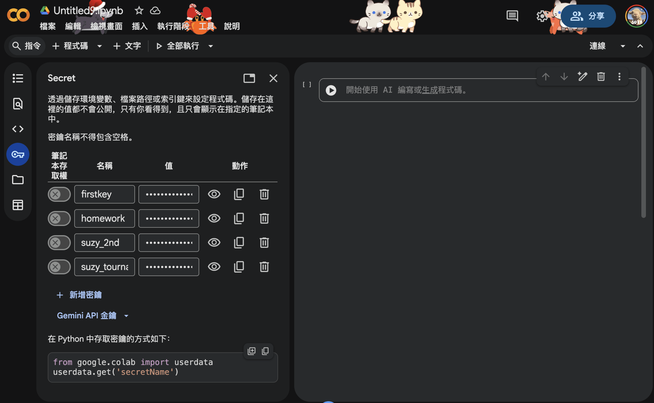 Google Colab 有提供可以儲存 API Key 的地方