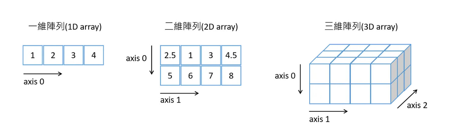 import numpy as npa = np.array([1, 2, 3, 4]) #一維陣列建立