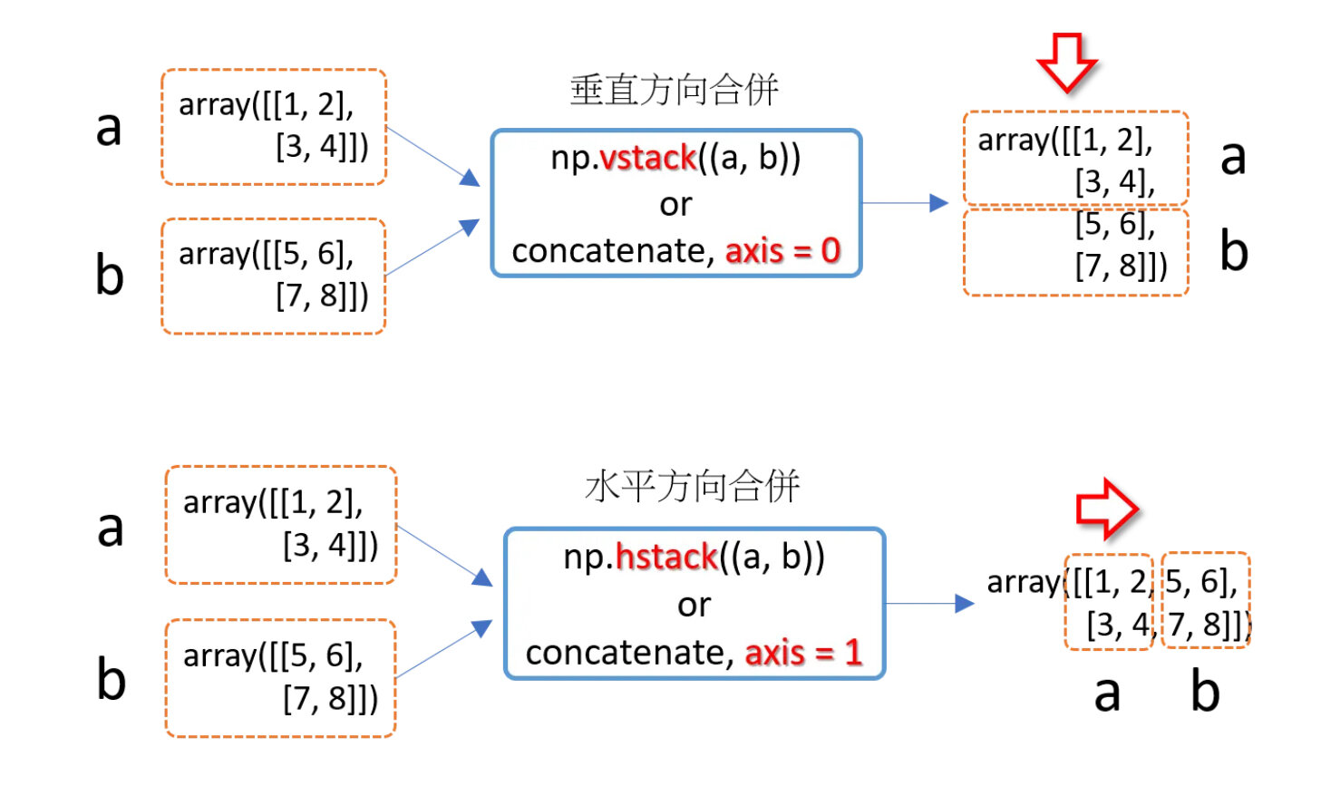 >>> np.concatenate((a, b), axis = 0) # axis=0,沿垂直方向合併