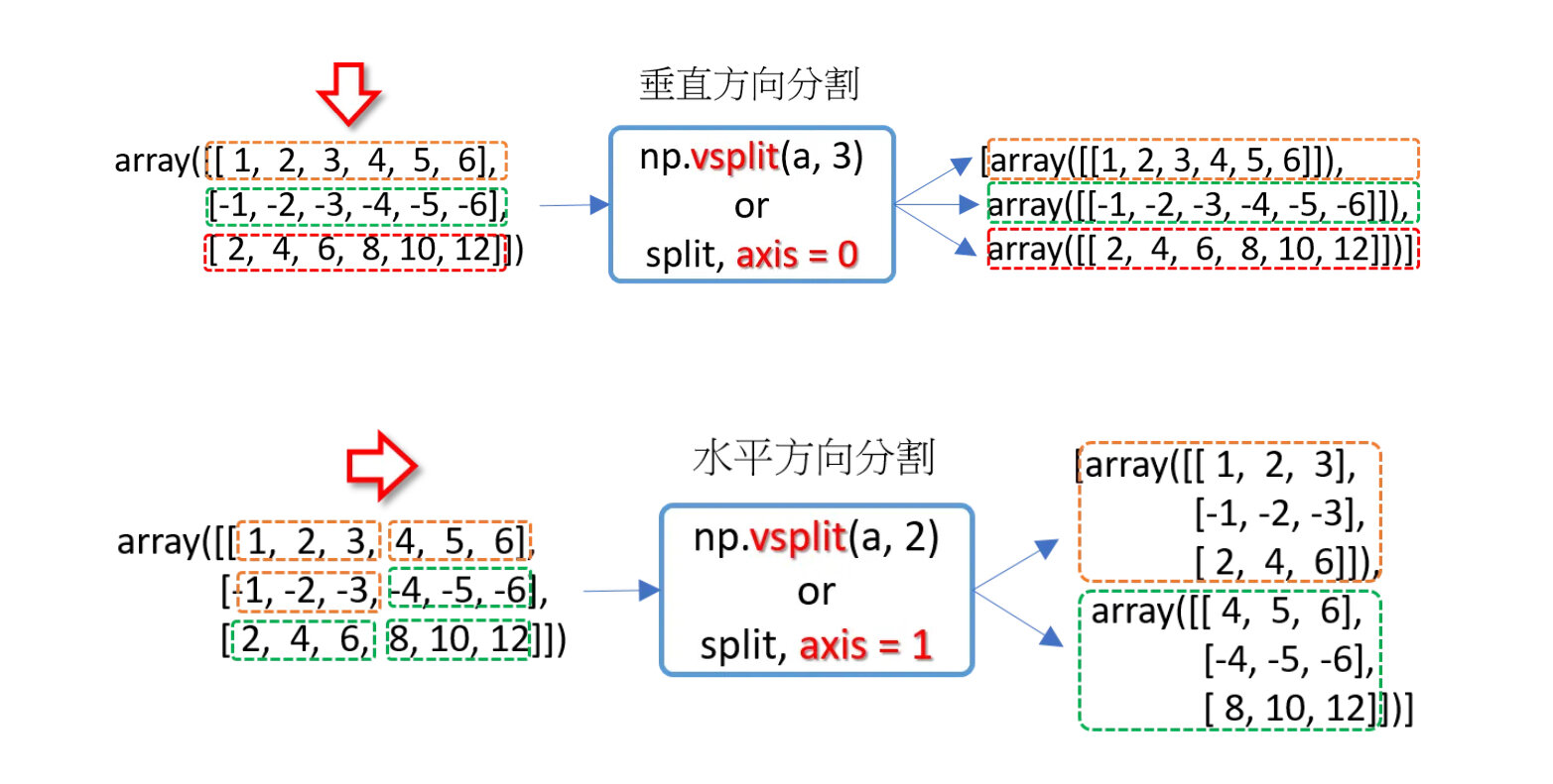 >>> np.split(a, 3, axis=0) # axis=0,沿垂直方向分割