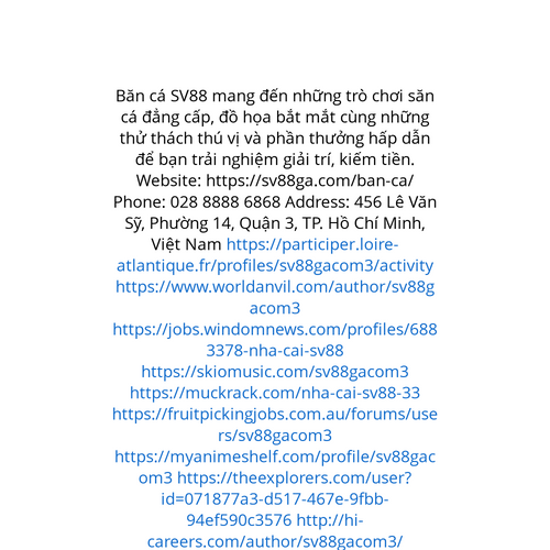 Website: https://sv88ga.com/ban-ca/ Băn cá SV88 mang đến những trò chơi săn cá đẳng cấp, đồ họa bắt mắt cùng những thử thách thú vị và phần thưởng hấp dẫn để bạn trải nghiệm giải trí, kiếm tiền. Phone: 028 8888 6868 Address: 456 Lê Văn Sỹ, Phường 14