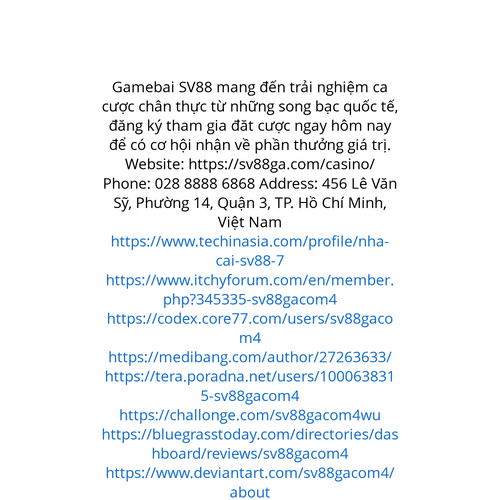 Website: https://sv88ga.com/casino/ Gamebai SV88 mang đến trải nghiệm ca cược chân thực từ những song bạc quốc tế, đăng ký tham gia đăt cược ngay hôm nay để có cơ hội nhận về phần thưởng giá trị. Phone: 028 8888 6868 Address: 456 Lê Văn Sỹ, Phường 1