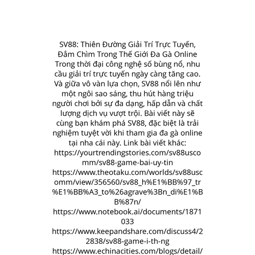 Website: https://writeablog.net/sv88uscomm/sv88-da-ga-campuchia SV88: Thiên Đường Giải Trí Trực Tuyến, Đắm Chìm Trong Thế Giới Đa Gà Online Trong thời đại công nghệ số bùng nổ, nhu cầu giải trí trực tuyến ngày càng tăng cao. Và giữa vô vàn lựa chọn,