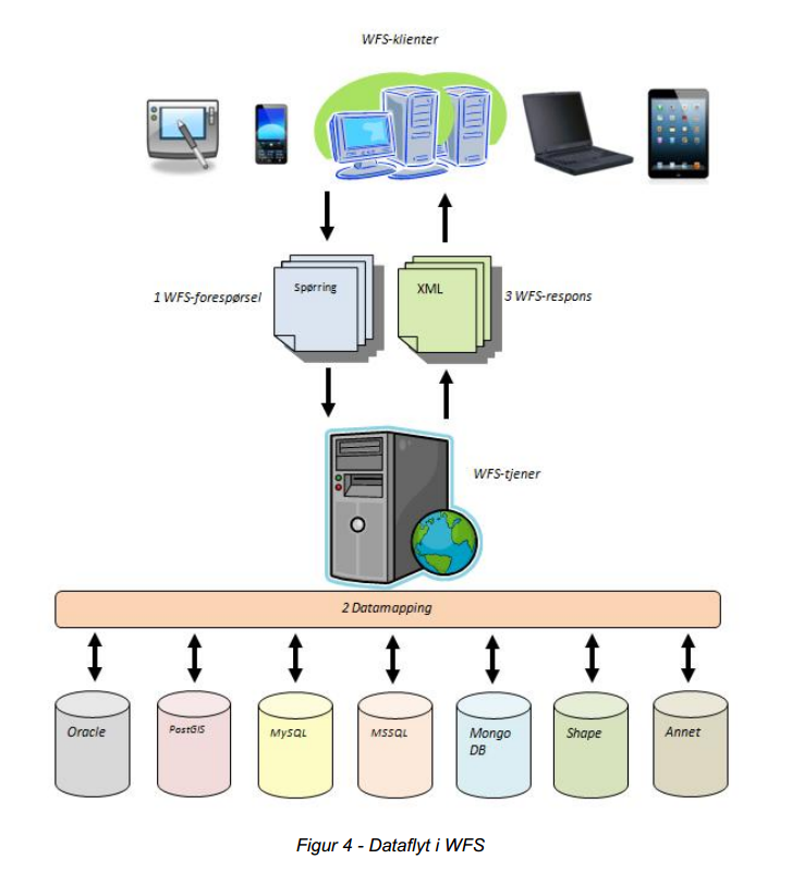 - WFS Serveren vil respondere på forespørselen og returnere de forespurte dataene til klienten på GML format