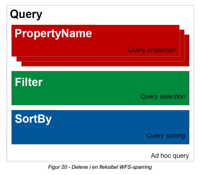 - En WFS spørring (Query) må innholde typeNames som er en obligatorisk parameter. I tillegg bygges spørringen opp av tre deler: