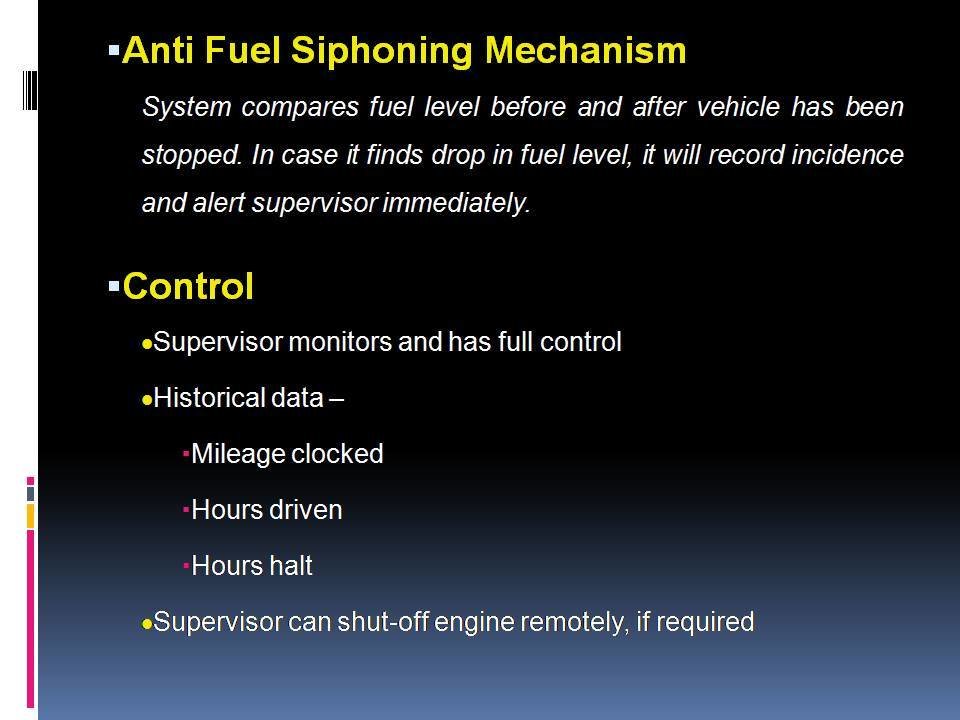 Partially if we stick to existing arrangement of drawing fuel. It would be possible to track and monitor such vehicle on map using web interface, monitor refuelling events as well as any fuel siphoning, if attempted. However, it would not be possible to get fuel drawing transaction detail on real time.