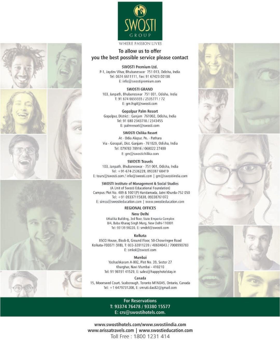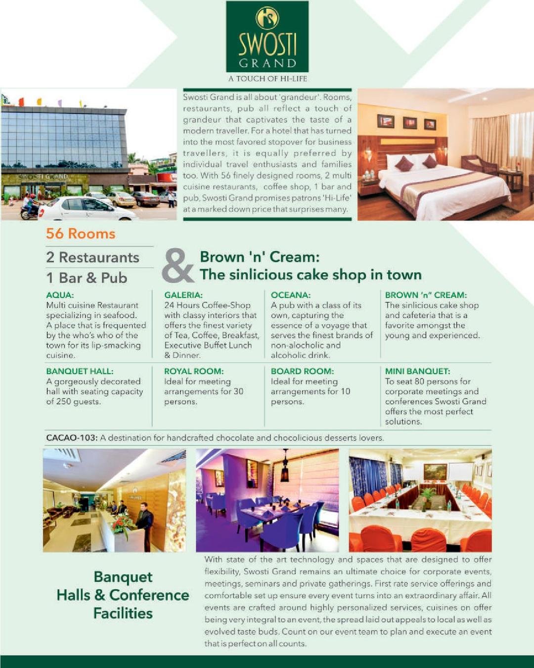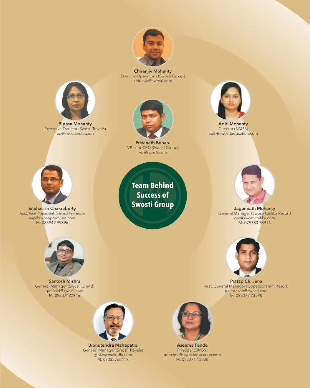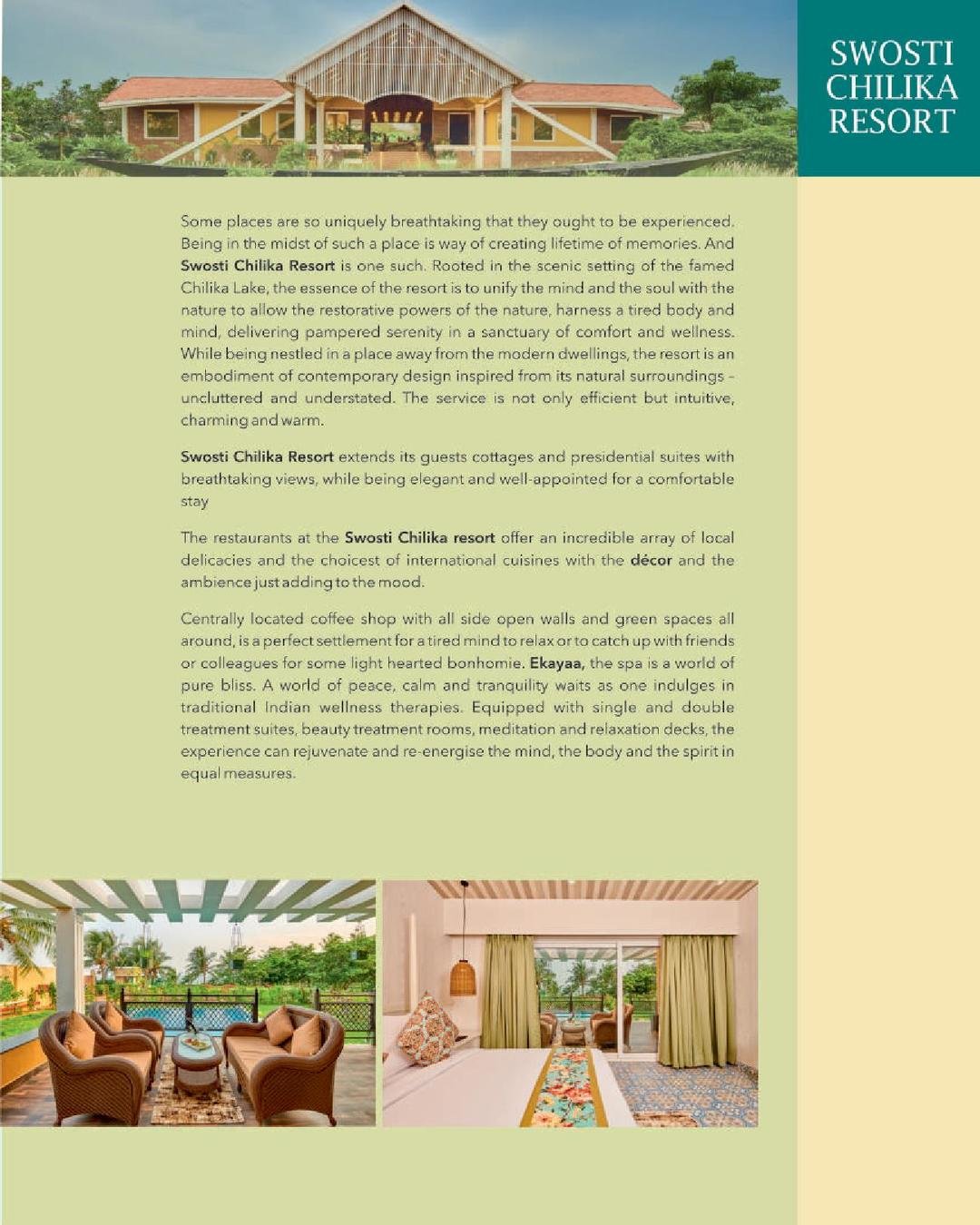 Swosti Group is the largest hotel chain in Odisha consisting of two majestic hotels in Bhubaneswar namely, Swosti Grand and Swosti Premium, and two resorts; one at Chilika and another at Gopalpur.
