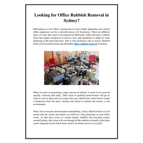 When searching online for office rubbish removal in Sydney, contact Sydney Rubbish Removal to organise a free quote or visit their website to learn more information about the range of different services they provide: https://sydneyrubbishremoval.com.au/services/office-rubbish-removal-sydney/