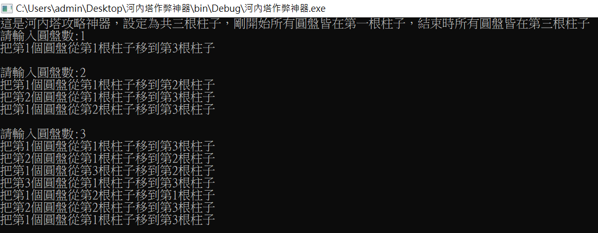 cout << "這是河內塔攻略神器,設定為共三根柱子,剛開始所有圓盤皆在第一根柱子,結束時所有圓盤皆在第三根柱子" << endl;