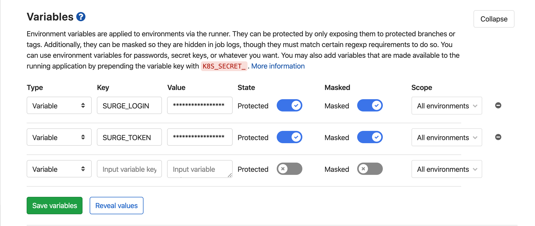 - Add the variable SURGE_LOGIN (login string from ~/.netrc) and SURGE_TOKEN (password string from ~/.netrc).