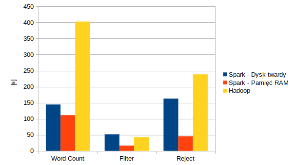 Wyniki wydajności operacji: Word Count, Filter i Reject na platformach Apache Spark oraz Apache Hadoop dla najbardziej wydajnej strategii przechowywania danych.