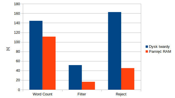 Wyniki wydajności operacji: Word Count, Filter i Reject na platformie Apache Spark ze względu na zastosowaną strategię przechowywania danych.