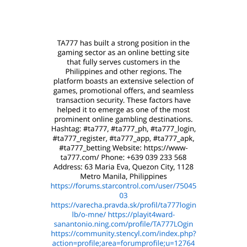 Website: https://www-ta777.com/ TA777 has built a strong position in the gaming sector as an online betting site that fully serves customers in the Philippines and other regions. The platform boasts an extensive selection of games, promotional offers