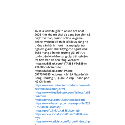 Website: https://ta888.uk.com/https://ta888.uk.com/ TA88 là website giải trí online ngày càng phổ biến nhờ hệ sinh thái game phong phú bao gồm thể thao, casino online và trò chơi đổi thưởng. Website có thiết kế tối ưu cùng hệ thống vận hành mượt mà, mang lại trải nghiệ
