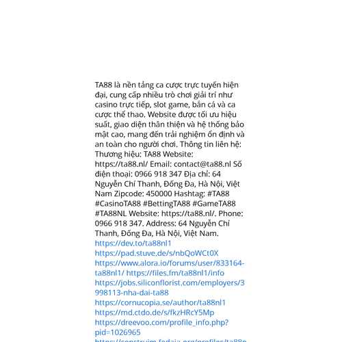 Website: https://ta88.nl/. TA88 là nền tảng ca cược trực tuyến hiện đại, cung cấp nhiều trò chơi giải trí như casino trực tiếp, slot game, bắn cá và ca cược thể thao. Website được tối ưu hiệu suất, giao diện thân thiện và hệ thống bảo mật cao, mang đ
