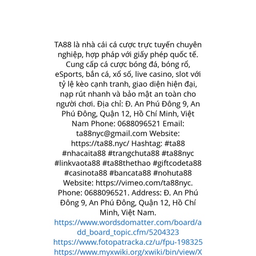 Website: https://vimeo.com/ta88nyc. TA88 là nhà cái cá cược trực tuyến chuyên nghiệp, hợp pháp với giấy phép quốc tế. Cung cấp cá cược bóng đá, bóng rổ, eSports, bắn cá, xổ số, live casino, slot với tỷ lệ kèo cạnh tranh, giao diện hiện đại, nạp rút n