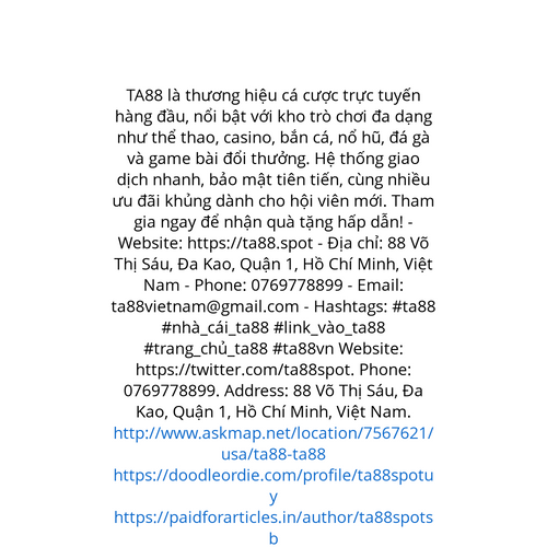 Website: https://twitter.com/ta88spot. TA88 là thương hiệu cá cược trực tuyến hàng đầu, nổi bật với kho trò chơi đa dạng như thể thao, casino, bắn cá, nổ hũ, đá gà và game bài đổi thưởng. Hệ thống giao dịch nhanh, bảo mật tiên tiến, cùng nhiều ưu đãi