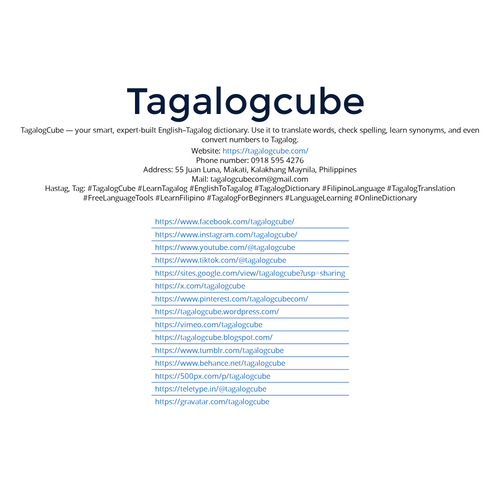 TagalogCube — a trusted English–Tagalog dictionary built for learners. Clean layout, real examples, and reliable translations. Website: https://tagalogcube.com/ Phone number: 0918 595 4276 Address: 55 Juan Luna, Makati, Kalakhang Maynila, Philippines