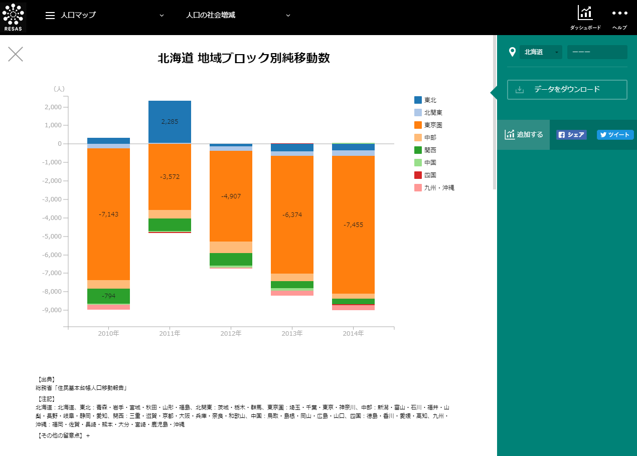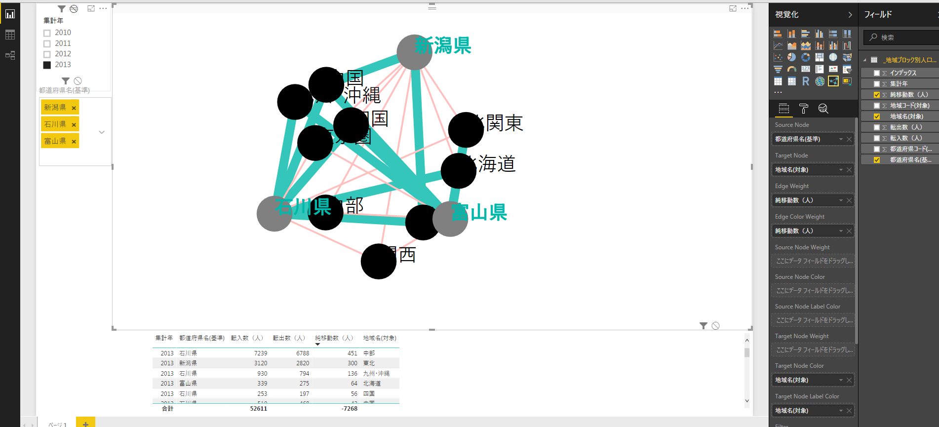 凡例ちょっと付けておりませんが青太線が人口流入過多、橙細線が流出過多…のつもりです。