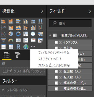 視覚化ペインの・・・をクリックすると、カスタムビジュアルを読み込めます。